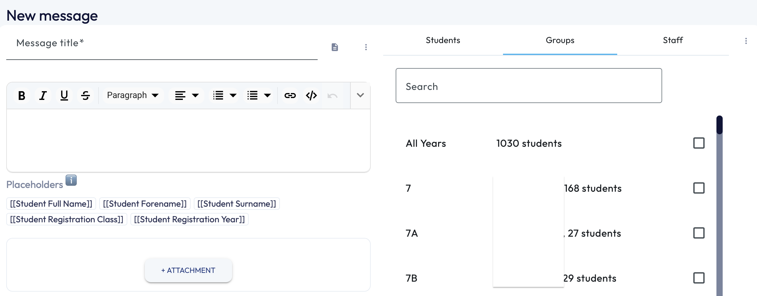 You can choose to locate your recipients by filtering between the following headings Students (parents/carers), Groups (Year/Tutor Groups or Classes) and Staff.