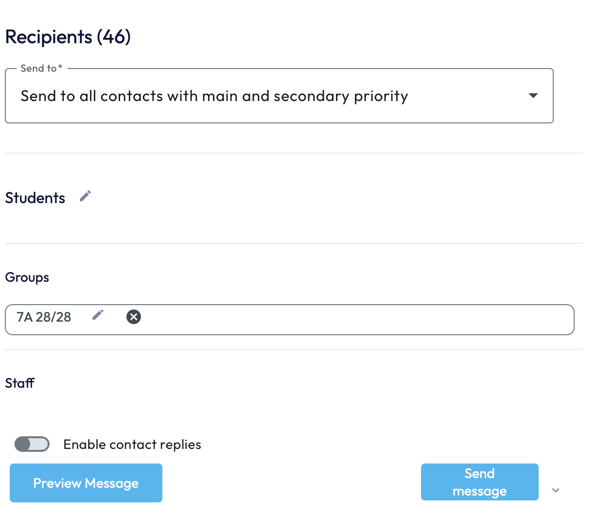 You will also see summary of the recipients selected, in this case, you cans form the screenshot above - all Year 8's parent/carers with main or secondary priority will receive this message.