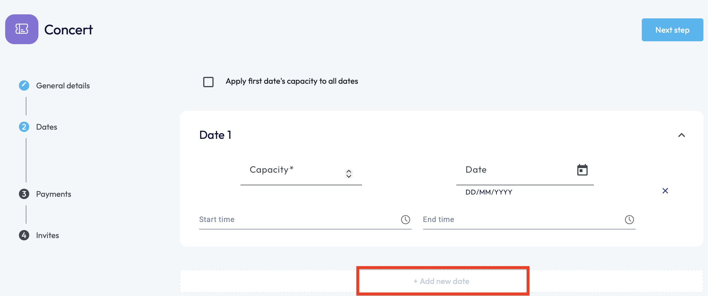 If the capacities remain the same across the dates set up for the concert, you can tick the box above the first date 'Apply first date's capacity to all dates'.