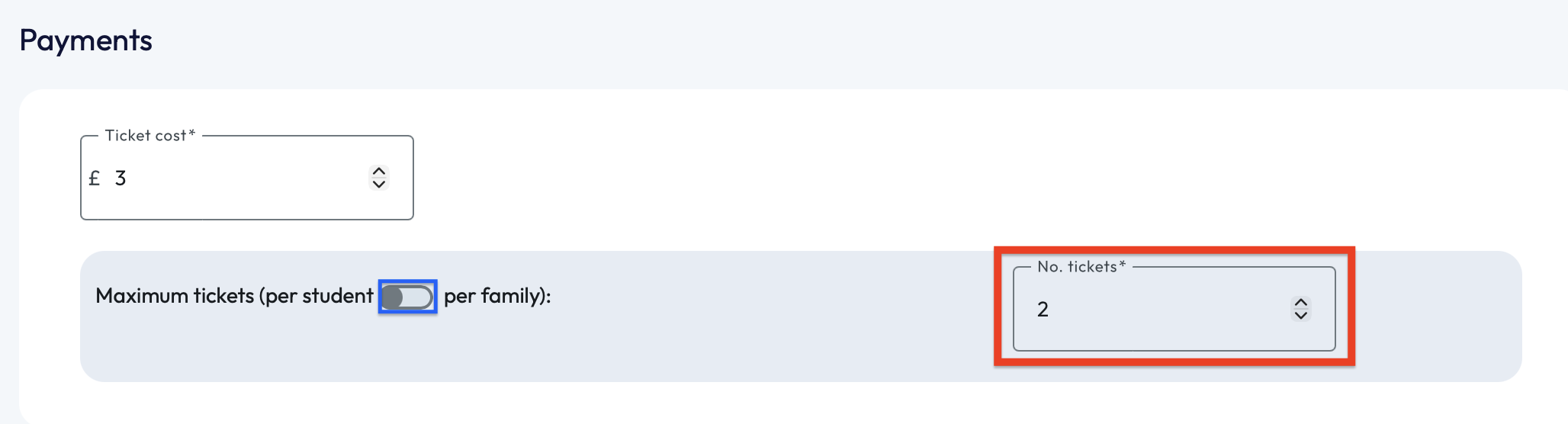 However if families have more than one child within the school, you can click the slider as highlighted in blue below to set a maximum amount of tickets per student per family.