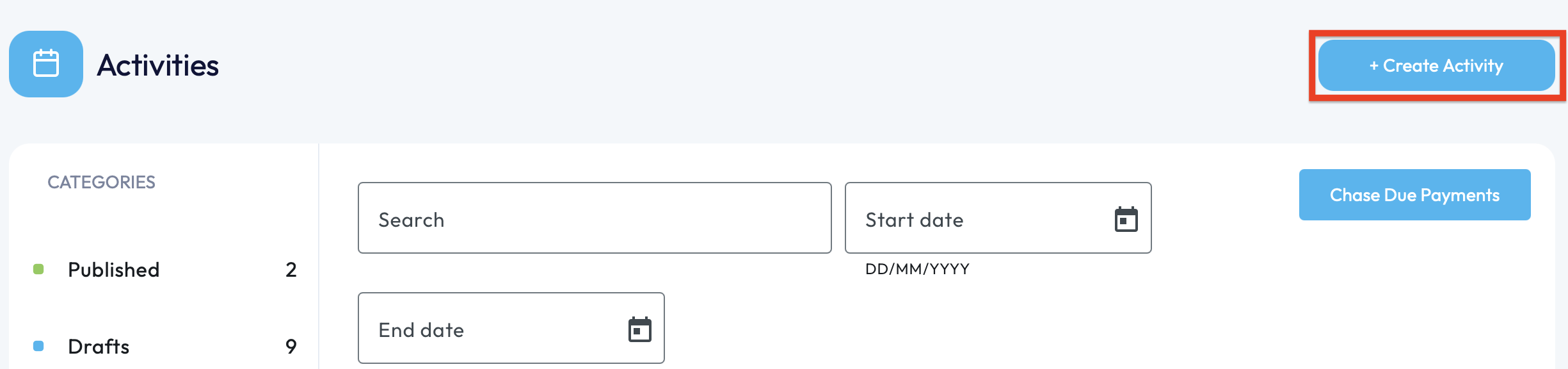 2. Upon opening the 'Activities' section, you'll be presented with the main Activities page where you can view all Published, Draft, Cancelled and Past Activities. You will also be able to search for activities using the date range.
