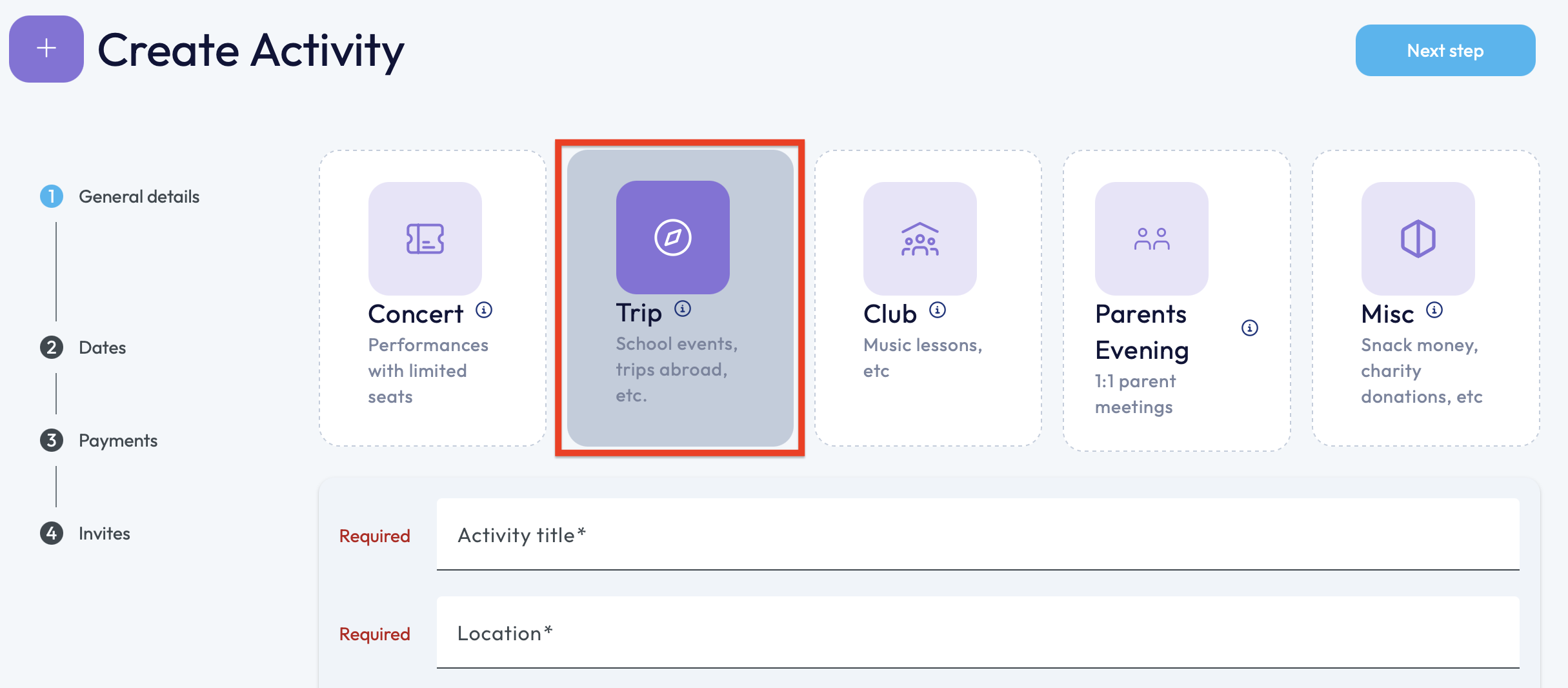 4. After selecting the 'Trip' option, you'll be required to fill in the details underneath: Activity Title, Location and Description. Without this information, you will not be able to proceed to the next step of creating this activity.