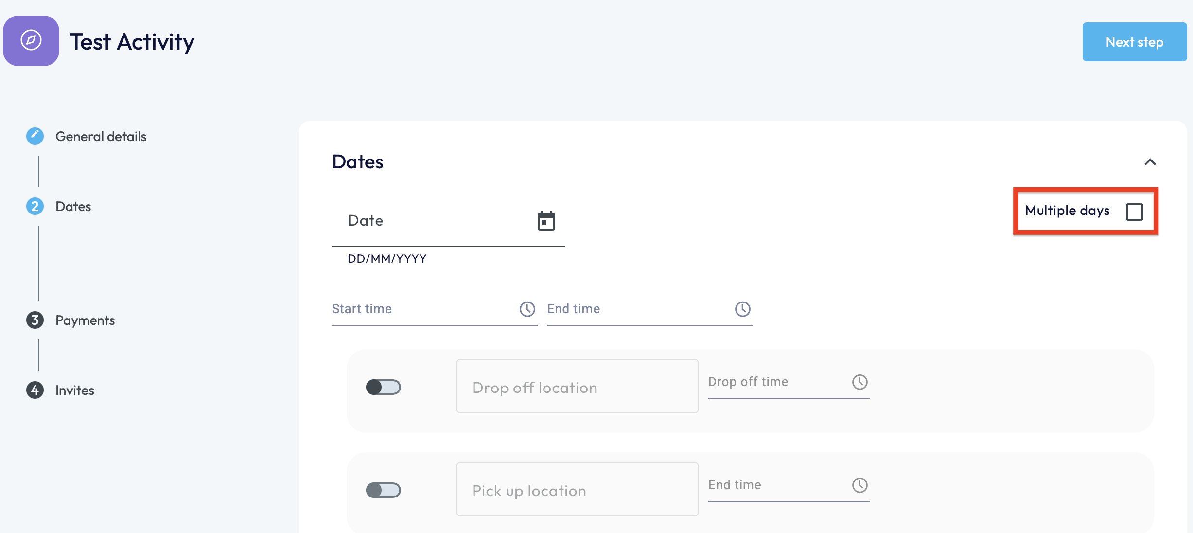 If the activity/trip takes place over more than one day, make sure to select the 'Multiple Days' option which will allow you to input the start date and end date as well as the times associated.