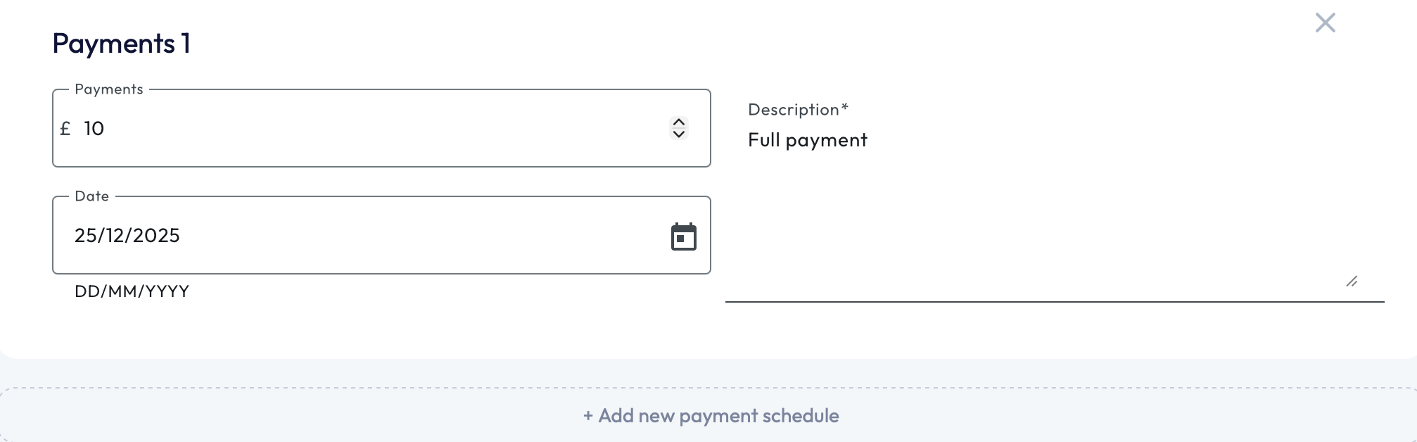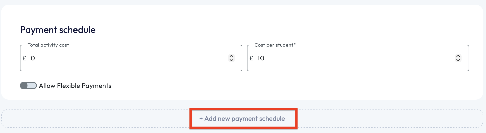 You can add as many payment schedules as you wish, keep adding until you reach the total cost per student.