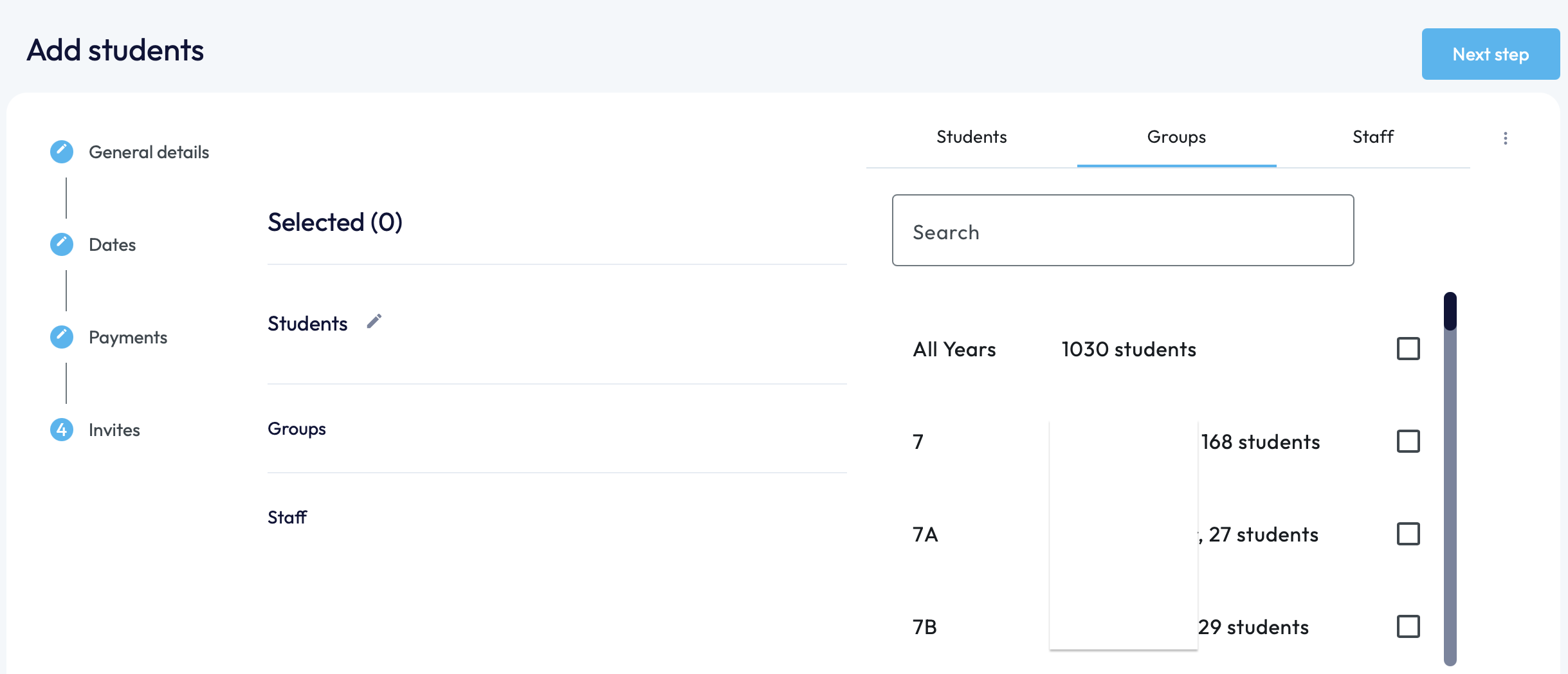 13. Once you are happy with the students you have chosen, click on the 'Next Step' button in the top right-hand corner.