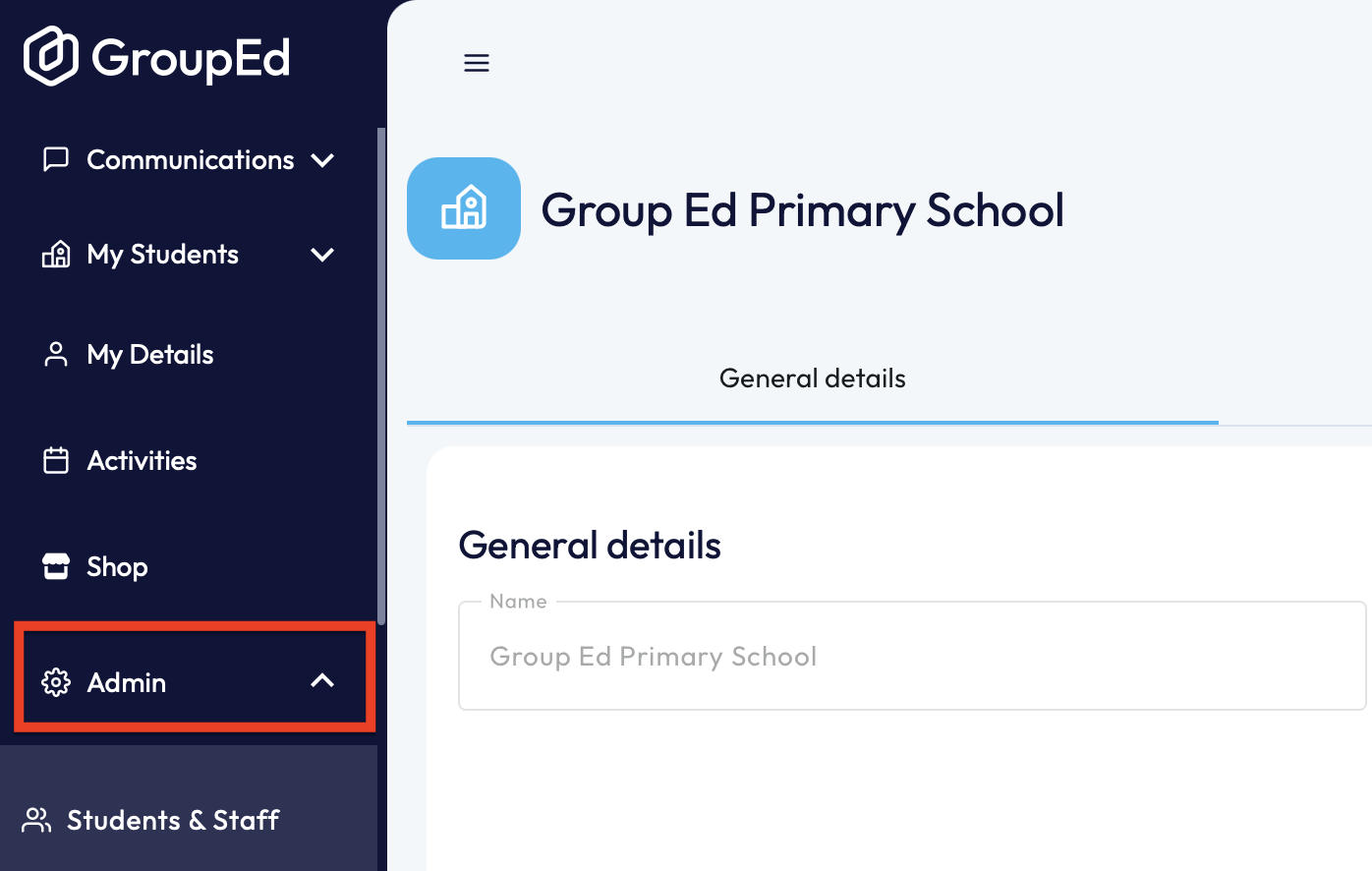1. First you'll need to locate the staff member in question. You can do this by navigating to the 'Students & Staff' section under the 'Admin' drop down.