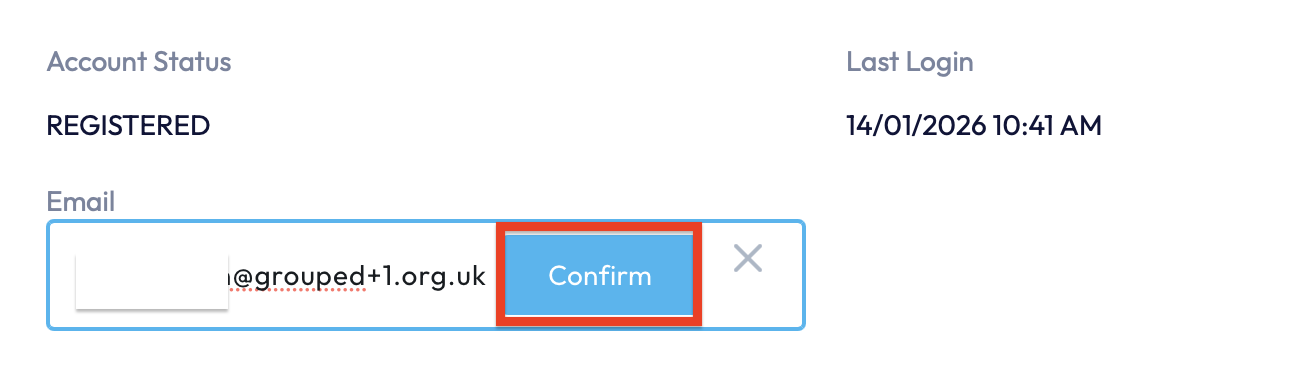 5. When the email address has been edited, you can save the new email by clicking on the 'Confirm' button next to the email.