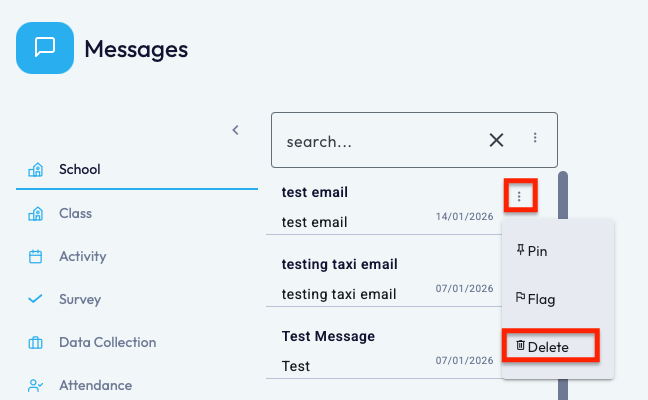 a. Click the 3 dots on the right hand corner of the message you wish to delete. This will load the pop up as shown below where you can simply click the 'Delete' option to delete that message.