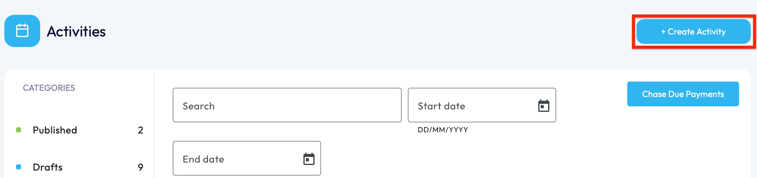 2. Upon opening the 'Activities' section, you'll be presented with the main Activities page where you can view all Published, Draft, Cancelled and Past Activities. You will also be able to search for activities using the search bar for filtering by date range.
