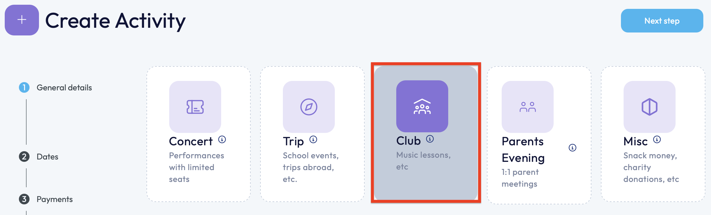 Based on the type of activity you're creating, you'll need to select the appropriate type of activity: in this case you can select the 'Club' option.
