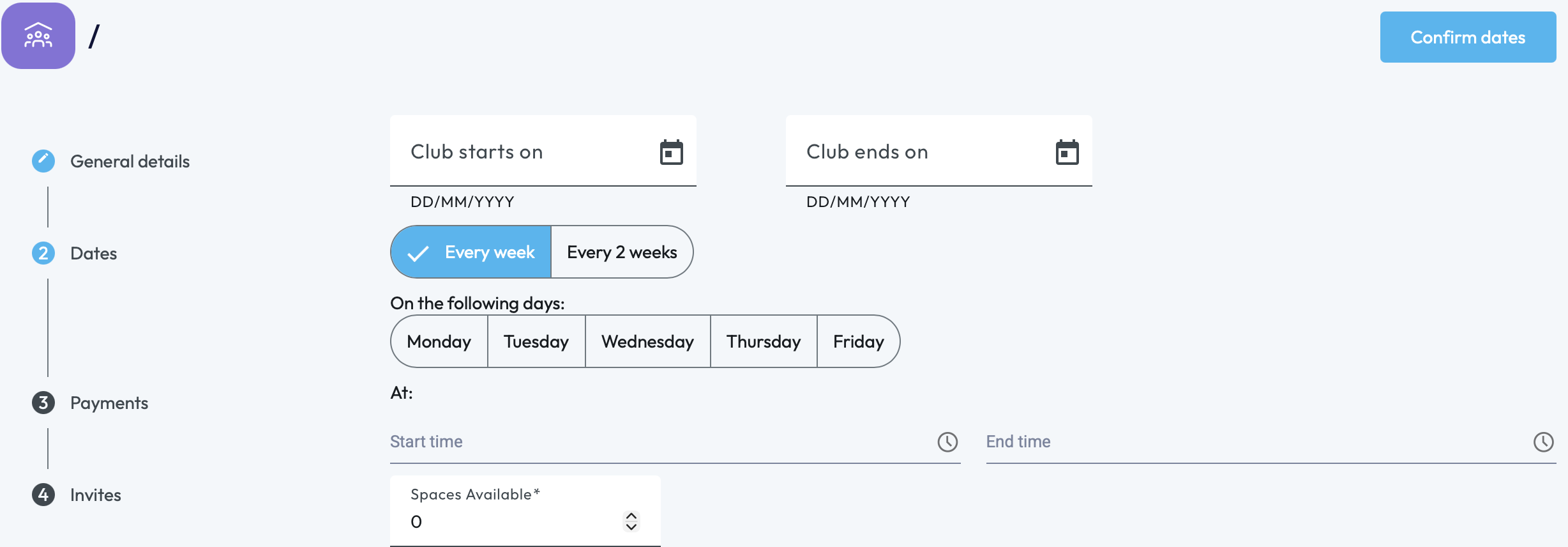 Confirming the dates will allow you to preview all the dates that this club will take place during the time frame set. Once you're happy with those, click 'Confirm' and it will take you to Page 3, Payments.