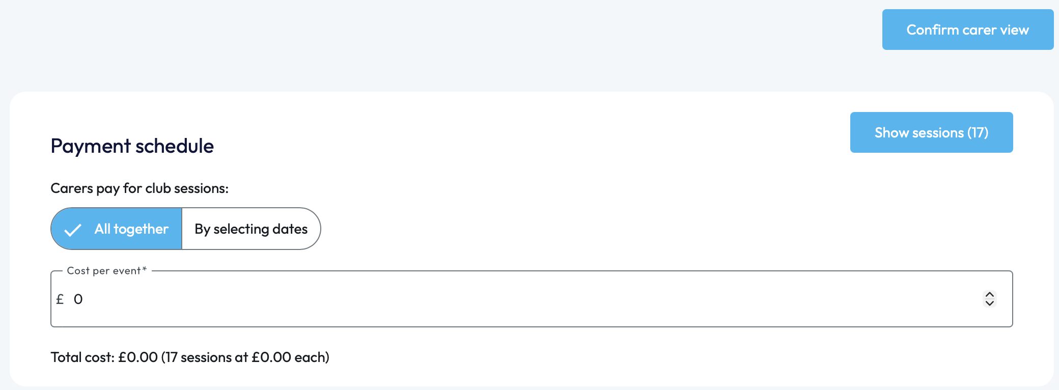 Once the details have been inputted, you can view the sessions under 'Show Sessions' or you can continue to the final step by clicking 'Confirm Carer View' in the top right-hand corner.