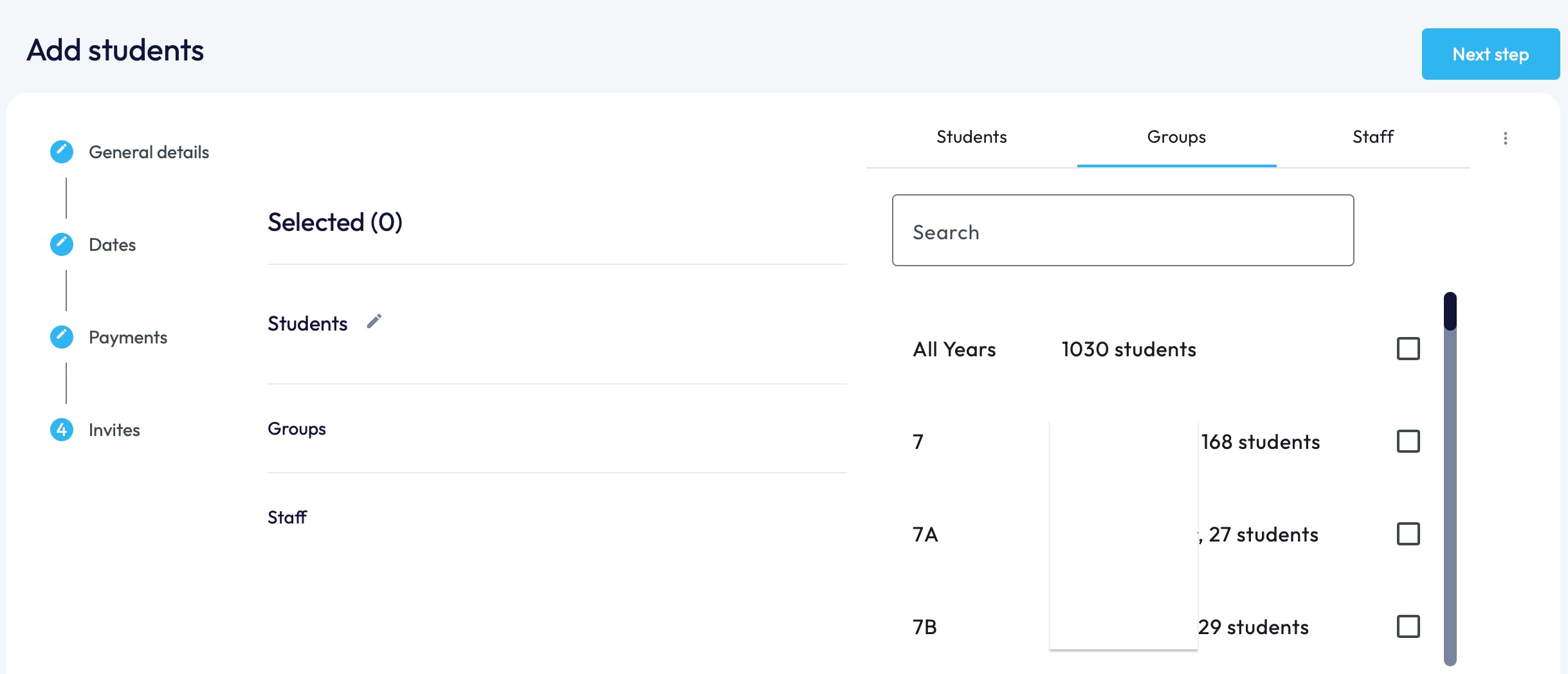 If you navigate to the 'Groups' section on the right-hand side, you can then tick the boxes associated to the year and tutor groups/classes. If there are then any students you wish not to select you can navigate to the students section and de-tick the boxes. Once a group is selected the box will turn blue with a white tick in the center.