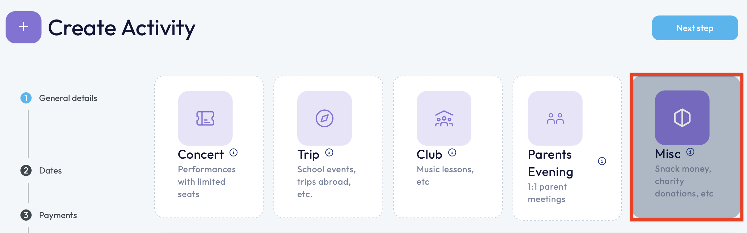 4. After selecting the 'Misc' option, you'll be required to fill in the details underneath: Activity Title and Description. Without this information, you will not be able to proceed to the next step of creating this activity.