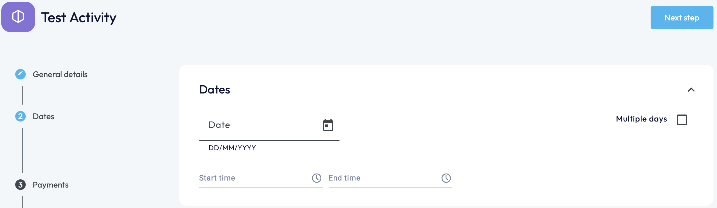 If the activity takes place over more than one day, make sure to select the 'Multiple Days' option on the right-hand side which will allow you to input the start date and end date as well as the times associated.