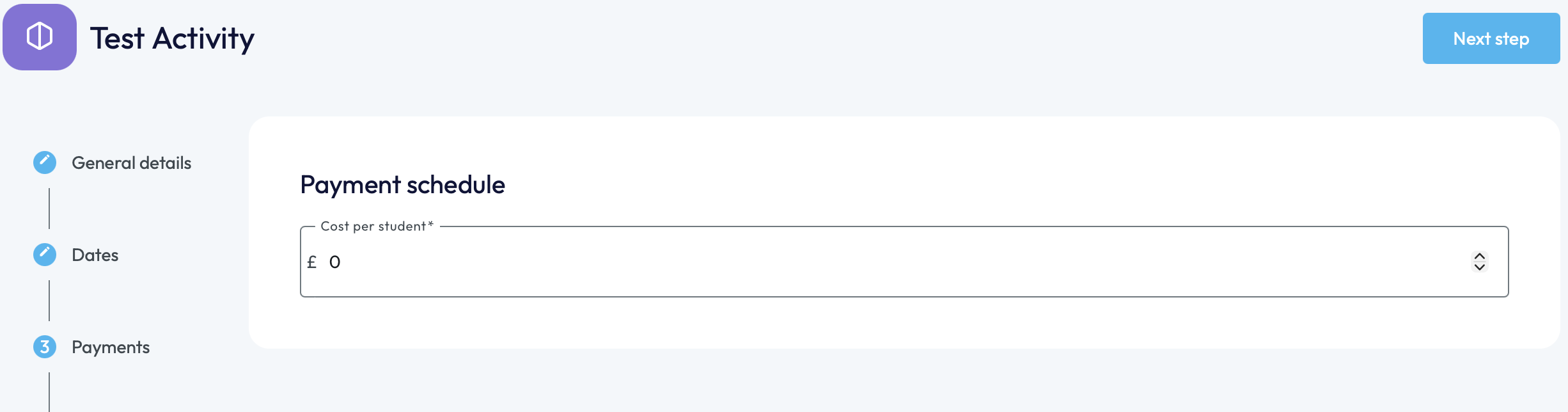 If the activity involves a payment, you will be required to insert here a 'Cost per Student', this will then automatically populate the box below: