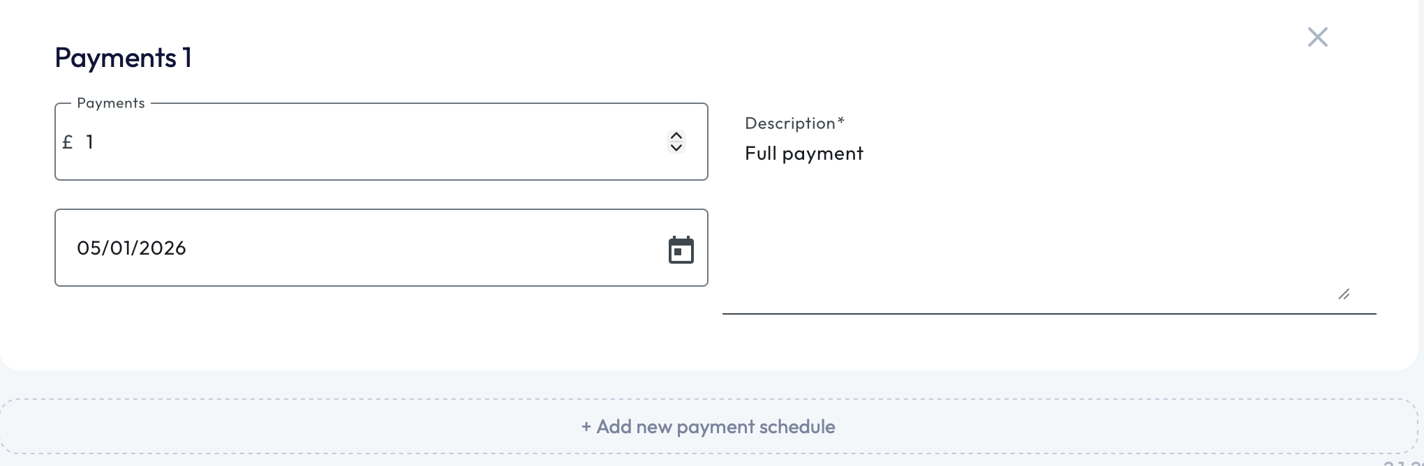 If you want to take a Full Payment for the cost of the activity you can input the data against Payment 1, as shown above. Alternatively, if you wish to allow installments, you can click on 'Add New Payment Schedule', this will auto-populate a second payment box. You will need to calculate the cost between each installment to ensure the installments add