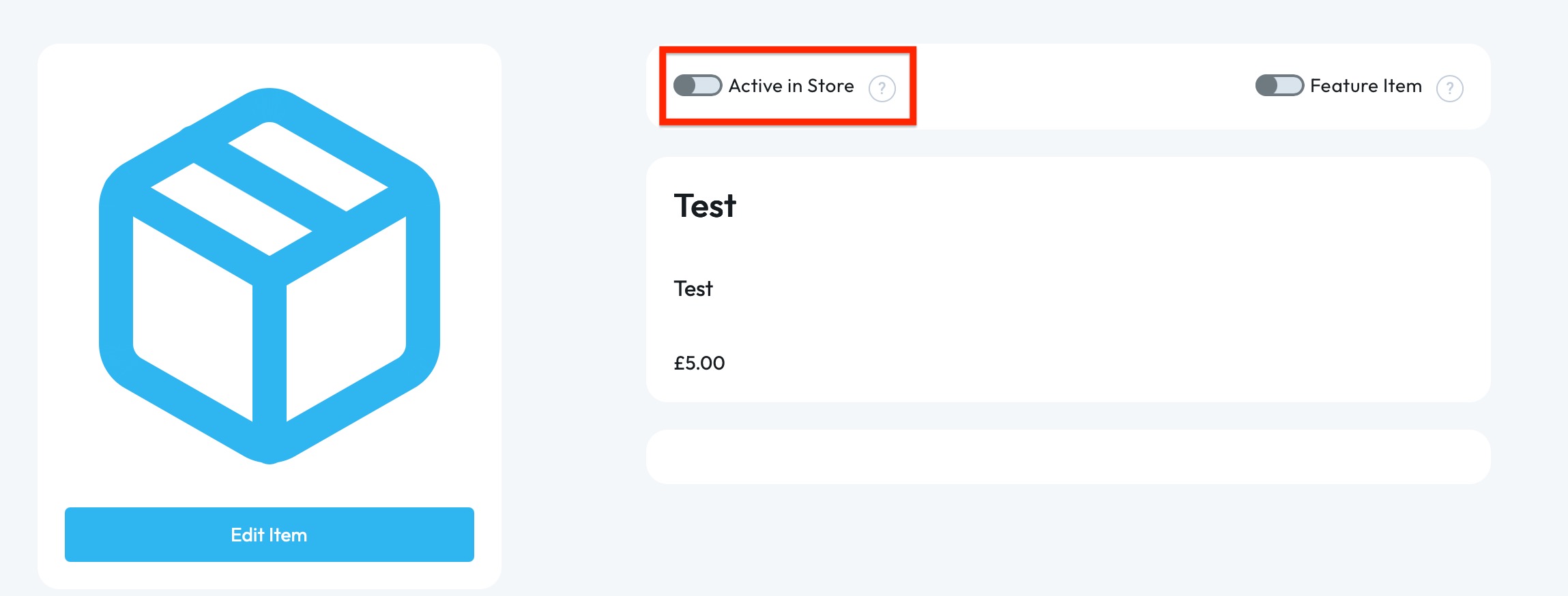 5. To activate the item, you will need to click the slider 'Active in Store'.
