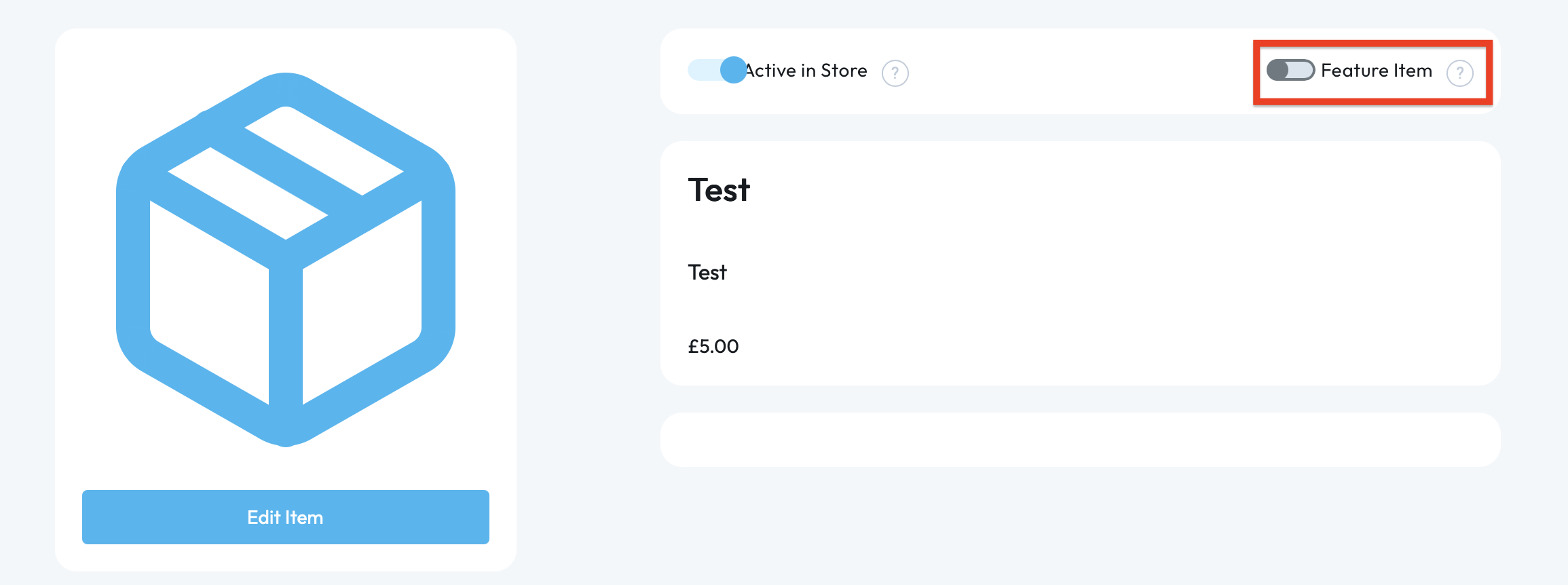 b. alternatively, you can click into the item which will load the item details. You now need to click the slider next to 'Feature Item' (it will turn blue once enabled).